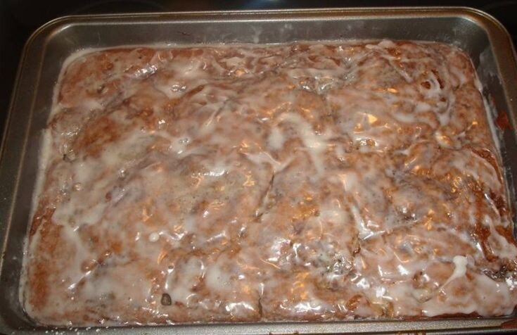 For Glaze: While the cake is baking, make the glaze. In a bowl, mix the powdered sugar, vanilla, and milk until the glaze is desired consistency. When the cake comes out of the oven, immediately but carefully pour onto hot cake. Try to pour as evenly as possible. You might have to pick up the cake and tilt it to spread the glaze evenly. I even poured some out that pooled at the corners and repoured that over the top. Let the cake sit for awhile for the glaze to set