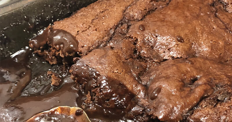 Stir together the flour, 3/4 C. sugar, 1 1/2 T. cocoa. Stir in milk and vanilla till smooth. Spoon this mixture over the melted butter.