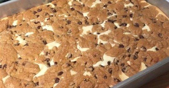 Spread 1 roll of cookie dough on the bottom of a 9×13-inch baking pan to form the base. Spread cream cheese mixture evenly on top. Pinch off small pieces of the remaining cookie dough and distribute them on the cream cheese mixture.