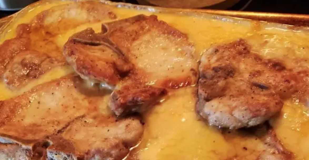 In skillet brown pork chops in 1 tablespoon butter. Grease a cooking dish with the remaining tablespoon butter and layer potatoes. Pour mixture over potatoes and place browned chops on top. Sprinkle paprika on top.