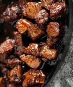 - Place some of the meat in the pan in a single layer. It should sizzle loudly when it hits the pan – if it doesn’t, the pan isn’t hot enough. Don’t stir or disrupt the meat for 30 to 45 seconds. You want it to sizzle and brown on one side. Scoop as many steak bites as you can with your spatula and flip them over. Repeat until all the meat is turned. Cook for an additional 30 to 45 seconds-just long enough to sear the outside of the meat but NOT cook the inside.
