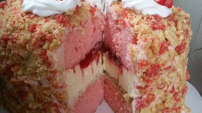 HOW TO MAKE AN EASY HOMEMADE STRAWBERRY SHORTCAKE CHEESECAKE WITH 4 LAYERS OF STRAWBERRY CAKE, CREAMY CHEESECAKE, WHIPPED CREAM CHEESE FROSTING, AND CRUNCHY STRAWBERRY FLAVORED COOKIE CRUMBLES!