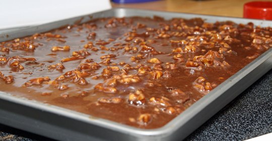 Next sprinkle chocolate chips and pecan pieces. It’s best to do this while the frosting is still warm, so the chocolate chips will melt slightly.