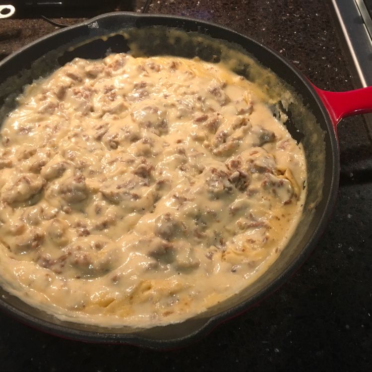 With your finger tear small pieces of sausage and add them in a single layer to a large heavy skillet. Brown the sausage over medium-high heat until no longer pink. Reduce the heat to medium-low. Sprinkle on half the flour and stir so that the sausage soaks it all up, then add more little by little. Stir it around and cook it for another minute or so, then pour in the milk, stirring constantly.
